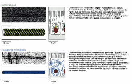 Caption: : Los tres tipos de filamentos proteicos que constituyen el citoesqueleto. Se muestra una microgafía de cada tipo de filamento y un diagrama esquematico de cómo están formados a partir de susu subunidades. También puede observarse esquematicamente la distribucion en un tipo de célula epitelial. [Alberts y col., 2007]