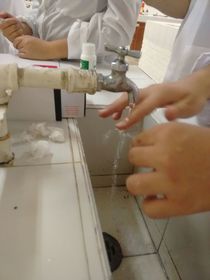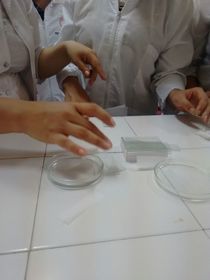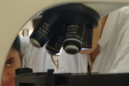 aquí podemos ver el microscopio una lamina y encima de la lamina esta ubicada una gota de agua estancada con boñiga de un bobino y después se pone la laminilla