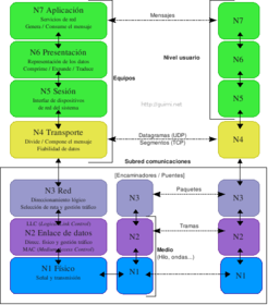El modelo de referencia OSI(Open Systems Interconection) sirve para regular la comunicación entre los sistemas heterogenios y es así como surge en el año de 1983 como el resultado del la ISO(International Standart Organization) para la estandarización internacional de los protocolos de comunicación. * Cada una de las capas desempeña funciones bien definidas.* Los servicios proporcionados por cada nivel son utilizados por el nivel superior.*Existe una comunicación virtual entre 2 mismas capas, de manera horizontal.*Existe una comunicación vertical entre una capa de nivel N y la capa de nivel N + 1.*La comunicación fí sica se lleva a cabo entre las capas de nivel 1.