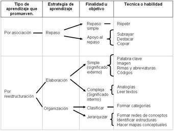 se analizan las estrategias según el tipo de proceso cognitivo y finalidad perseguidos (Pozo, 1990) Las estrategias de repaso simple y complejo son útiles especialmente cuando los materiales que se ha de aprender no poseen o tienen escasa significatividad lógica, o cuando tienen poca significatividad psicológica para el aprendiz; de hecho puede decirse que son (en especial el repaso simple) las estrategias básicas para el logro de aprendizajes repetitivos o memorísticos (Alonso, 1991; Pozo, 1989). Las estrategias de elaboración suponen básicamente integrar y relacionar la nueva información que ha de aprenderse con los conocimientos previos pertinentes. Pueden ser básicamente de dos tipos: simple y compleja. Las estrategias de organización de la información permiten hacer una reorganización constructiva de la información que ha de aprenderse. Mediante el uso de dichas estrategias es posible organizar, agrupar o clasificar la información, con la intención de lograr una representación correcta de la información.