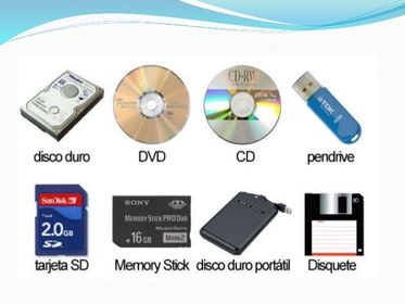 Se encargan de guardar o salvar los datos de los que hace uso la CPU para que ésta pueda hacer uso de ellos una vez que han sido eliminados de la memoria principal, ya que ésta se borra cada vez que se apaga la computadora. Pueden ser internos, como un disco duro, o extraíbles, como un CD. Algunos de ellos: