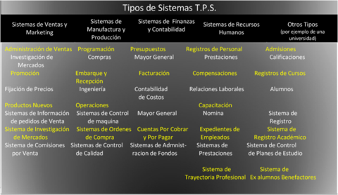 Sistemas de ventas y marketing: son los que realizan transacciones referentes a administración de ventas, investigación de mercados, productos nuevos, sistema de comisiones por venta, fijación de precios.Sistemas de manufactura y producción: sistemas por los cuales se realiza programación, compras, sistemas de ingeniería, control de calidad, control de máquina. Sistemas de finanzas y contabilidad: por los cuales se realizan presupuestos, facturación, contabilidad de costos, cuentas por cobrar y pagar. Sistemas de recursos Humanos: a través de esto se registra el personal, se realiza la nómina, el expediente de los empleados. Otros tipos: cualquier organización se realicen transacciones automatizadas, por ejemplo un el sistema de una compañía de seguros.