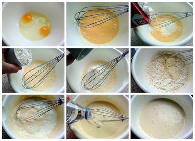 You should put a cup of flour into a bowl and add a half cup of milk, then you should add a little salt, a little sugar, then add one egg, then you must mix it all until a liquid mass.