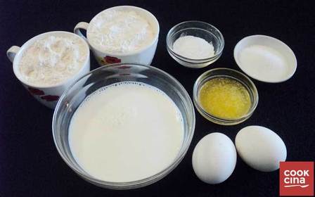 1 Eggs 1 Cup flour 1 Cup milk 1 Teaspoon butter 1 Pinch of salt 1 Pinch of sugar