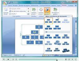 Insertar organigramas co el icono smart dat un diagrama gerarquico organigrama.se selecciona formas predefinidas o agregar formas que por lo contrario se puede disminuir su nivel de añadidura ,se puede colocar textos dentro de las mismas como cambiar de color.