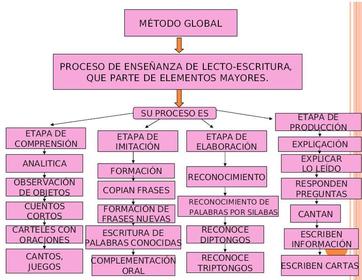 DESCRIPCIÓN:Proceso de lecto-escritura cuyo punto de partida es la sílaba.1. Se enseñan las vocales. se enfatiza en la lectura y escritura2. Las consonantes se enseñan respetando su fácil pronunciación. Luego, se pasa a la formulación de palabras 3. Cada consonante se combina con las cinco vocales. ma, me, mi, mo, mu. 4. Con varias sílabas se forman palabras. Luego, se construyen oraciones5. Se combinan consonantes con vocales en sílabas. am,em.im,om,um6. Se pasa a las sílabas mixtas,a los diptongos, triptongos y finalmente a las letras complejas. ñ, ll , ch , rr7. Con el silabeo se pasa con facilidad a la lectura mecánica.8. El libro que mejor representa este método es el SILABARIO.