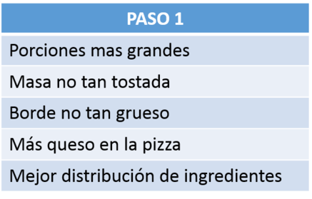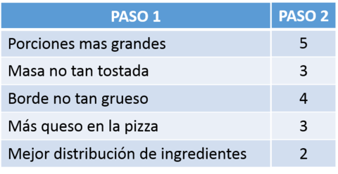 A continuación se presentara como se debe aplicar cada paso anteriormente expuesto.Para esto vamos a suponer un ejemplo de un local de pizzas que quiere conocer qué especificaciones exigen los clientes en las pizzas que consumen.Siendo este el caso a estudiar empezaremos entonces a aplicar cada uno de los pasos.