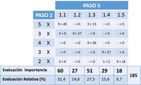 Siguiendo estos 5 pasos se obtiene la evaluación de importancia. El que mayor proporción tenga, este sera el más importante.Se tomará en cuenta nuevamente mas adelante en el desarrollo de la QFD.