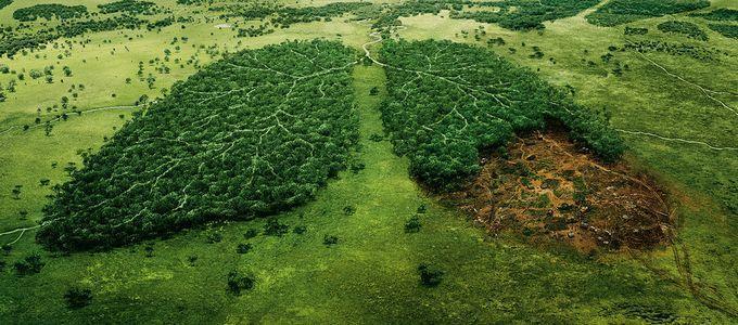Caption: : Ejemplo de metáfora visual: se establece una relación entre los bosques y dos pulmones, con los que mantiene una clara semejanza. Observamos que a uno de los bosques (los "pulmones de la Tierra") le falta una parte, que ha sido devastada.