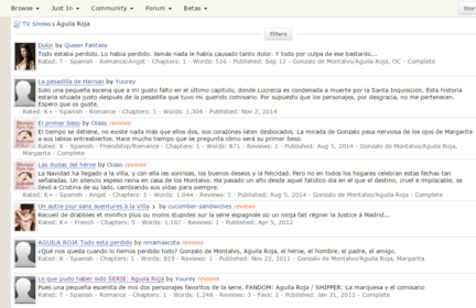 El público ha irrumpido en el universo de Águila Roja:1 - Club de fans que organizan encuentros con actores, visitas a los estudios, fiestas...2 - Relatos, continuaciones, historias paralelas: FanFiction.3 - Fan Art: dibujos, pinturas, creaciones de todo tipo.4 - Un web-cómic alternativo: Águila Coja.5 - Intervención continua en los foros, las redes sociales, blogs, encuentros digitales, comentarios, etc. Una de las mayores comunidades on line de España.6 - Gamers party, fast play... La Noche del Comisario.