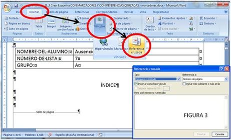 DEBEMOS TENER DEFINIDOS MARCADORES E IMANES TITULADAS PARA PODER CREAR EL VINCULO .SE DEBE CONSTRUIR UN TEXTO QUE IRA ENLAZANDO CON ELLOS.NOS SITUAMOS EN REFERENCIA Y SELECCIONAMOS REFERENCIA CRUZADA , SE ABRE EL CUADRO DE DIALOGO EN EL SE ESCOGE EL TIPO DE ELEMENTO QUE SE REfERENCIARA.