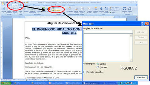 primeramente seleccionamos el texto donde vamos a poner un marcador.una vez seleccionado nos vamos a la ficha INSERTAR desplegamos el menu vinculos y seleccionamos MARCADOR.