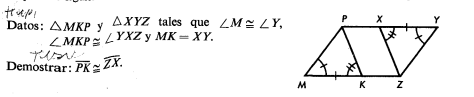 1) ANG (M)≅ ANG (Y) .................................DATO CONOCIDO 2) ANG (MKP)≅ANG (YXZ) ............................... DATO CONOCIDO 3) MK= XY ................................................DATO CONOCIDO 4)▲ MKP ≅ ▲ XYZ .................................POST LAL5) PK ≅ ZX ............................................... PCTCC ANG= ANGULO NOTA: LA APLICACION NO MUESTRA EL SIMBOLO DE ANGULO