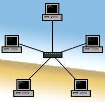 La topología estrella es una de las topologías más populares de un LAN (Local Area Network). Es implementada conectando cada computadora a un Hub central. El Hub puede ser Activo, Pasivo o Inteligente. Un hub activo es solo un punto de conección y no requiere energía electrica. Un Hub activo (el más común) es actualmente un repetidor con multiples puertos; impulsa la señal antes de pasarla a la siguiente computadora. Un Hub Inteligente es un hub activo pero con capacidad de diagnostico, puede detectar errores y corregirlo.