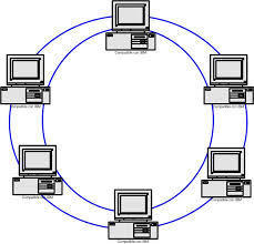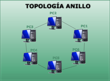 Las estaciones están unidas unas con otras formando un círculo por medio de un cable común. Las señales circulan en un solo sentido alrededor del círculo, regenerándose en cada nodo. Cada nodo examina la información que es enviada a través del anillo, si no está dirigida a él la pasa al siguiente nodo. La desventaja es que si se rompe una conexión, se cae la red completa.