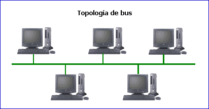 Las estaciones están conectadas por un único segmento de cable. A diferencia del anillo, el bus es pasivo, no se produce regeneración de las señales en cada nodo. Los nodos en una red de "bus" transmiten la información y esperan que ésta no vaya a chocar con otra información transmitida por otro de los nodos. Si esto ocurre, cada nodo espera una pequeña cantidad de tiempo al azar, después intenta retransmitir la información.