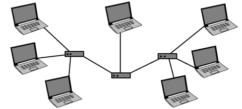 Los nodos están colocados en forma de árbol. Es parecida a una serie de redes en estrella interconectadas, con la diferencia que no tiene un nodo central sino un nodo de enlace troncal, generalmente ocupado por un hub o switch, desde el que se ramifican los demás nodos. Es una variación de la red en bus, la falla de un nodo no implica interrupción en las comunicaciones porque se comparte el mismo canal de comunicaciones.