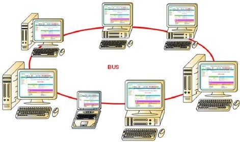 Caption: : Cuenta con un cable principal llamado Backbone, que lleva la comunicación a todos los nodos de la red, compartiendo un mismo canal de comunicación.