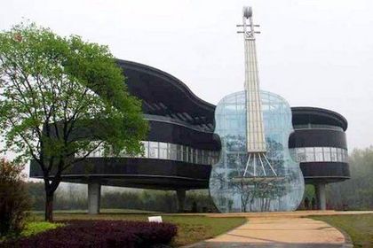Caption: : En aquesta imatges podem observar una casa en forma de piano i a davant una guitarra gegant