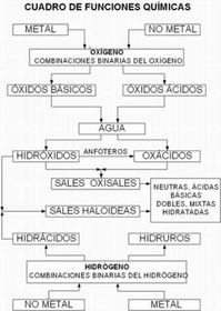 Son propiedades comunes que caracterizan a un conjunto de sustancias.También se les considera como familias químicas, aunque el nombre correcto es el de la función. En química inorgánica existen las siguientes funciones químicas:1.- Óxidos.2.- Hidróxidos.3.- Hidruros.4.- Ácidos.5.- Sales.
