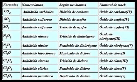 Nomenclatura tradicional. Se aplican las mismas reglas para los óxidos metálicos, con la diferencia de que para estos compuestos primero se escribe la palabra genérica anhídrido. (esta nomenclatura ya no debería utilizarse, pero se incluye porque aún se emplea para nombrar algunos ácidos. Nomenclatura stock. Se utilizan las misma reglas que para los óxidos metálicos.nomenclatura sistemática. Se aplican las mismas reglas ya mencionadas para los óxidos metálicos.