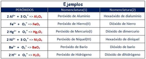 Son compuestos binarios formados por la unión de un metal con el ión peróxido. Se forman conforme a la nomenclatura tradicional y la stock, ya mencionadas.Generalmente los peróxidos se forman al unir el oxígeno con los metales alcalinos y alcalinotérreos (grupo 1 y grupo 2).