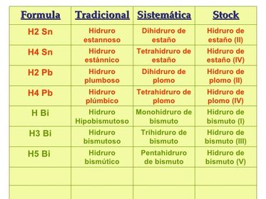 METÁLICO O IÓNOCO:Se compone de: Hidrógeno + Metal = Hidruro metálico.Nomenclatura tradicional. Se nombra primero la palabra genérica hidruro, seguida de la raíz del elemento acompañada de las terminaciones -oso o -ico, dependiendo del número de oxidación. Nomenclatura stock. Se aplican las siguientes reglas:1.- Regla 1: Se nombra con la palabra genérica hidruro, seguida de la raíz del metal y por ultimo el número de oxidación en romano.