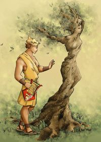De repente, su piel se convirtió en corteza de árbol, su cabello en hojas y sus brazos en ramas. Ya no podía correr. Apolo abrazó las ramas, pero incluso éstas se redujeron y contrajeron. Como ya no la podía tomar como esposa, le prometió que la amaría eternamente como su árbol y que sus ramas coronarían las cabezas de los héroes. Apolo empleó sus poderes de eterna juventud e inmortalidad para que siempre estuviera verde.