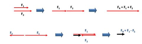 Cuando en un cuerpo actúa mas de una fuerza, éstas se pueden sumar.El resultado se denomina "fuerza neta" o "fuerza resultante" (Fr)Dos fuerzas o mas se dirigen en un mismo sentido, se suman, si se dirigen en sentido diferente se restan.