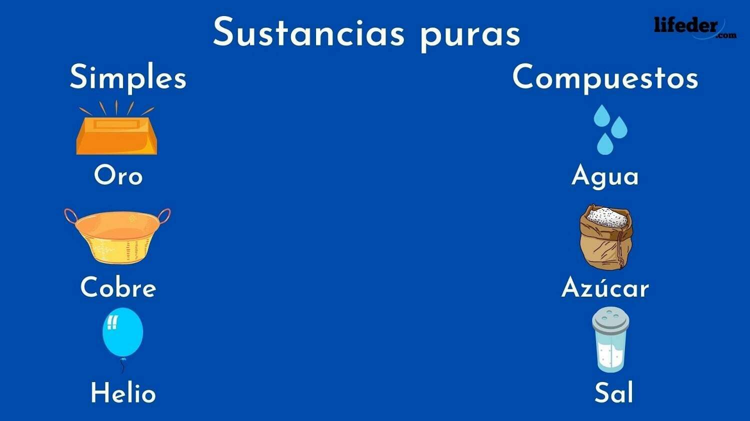 Elementos: Sustancias formadas por un solo tipo de átomo. Ejemplos: oro (Au), oxígeno (O₂), hierro (Fe).