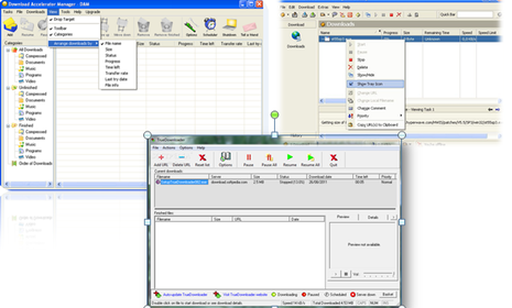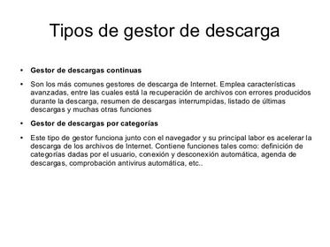 Todos los gestores de descarga funcionan de una forma similar, estos son algunos ejemplos:Para Windows: - Download Accelerator Manager Tiene 2 versiones, la versión free o gratuita y la versión de pago con algunas funciones extras. - Leechget Utiliza una interfaz parecida a la del Outlook y se integra en el Internet Explorer permitiendo iniciar y administrar las descargas de fácilmente. - True Downloader Se integra muy bien en el Internet Explorer y Mozilla Firefox