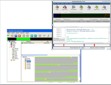 para Linux: - Multiget Sólo disponible en inglés y chino También tiene una versión para Windows - wxDownload Fast Disponible en varios idiomas, entre ellos el español. Es compatible con el Firefox, si se instala la extensión flashgot. También tiene una versión para Windows y una versión portable para llevarla en una memoria USB.