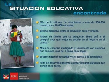 La experiencia peruana "Un laptop por niño"brecha educativa entre la educación rural y urbanaescaso material educativo y sin acceso a la tecnología.Falta de desarrollo docente a pesar del gran esfuerzo que ponen en la tarea.