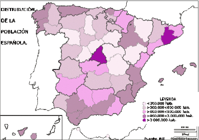 La densidad de población española es de 80 habitantes/km² que es inferior a la media de la unión europea. Está repartida de forma desigual, hay zonas muy pobladas y otras poco pobladas.