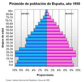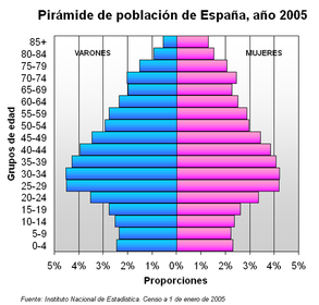 En las pirámides de población de un país, se puede observar el crecimiento o decrecimiento de un país a lo largo de la historia (100 años). Las barras indican la cantidad de varones o de mujeres de ese país, siendo ellos a la izquierda y ellas a la derecha. En el eje de abscisas se observan los valores o las cantidades de habitantes, y en el de ordenadas se sitúan las edades de la población, normalmente agrupadas de 5 en 5 (0-4, 5-9, 10-14, 15-19. . . ). Aquí se aprecia la pirámide actual de España. A continuación podremos apreciar el cambio que sufrió España en el siglo XX