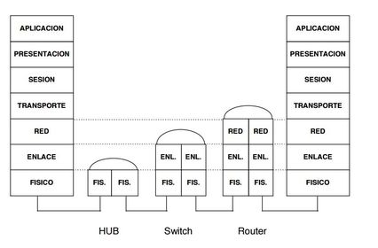 APLICACION: compuesto por las aplicaciones de red.TRANSPORTE: transferencia de datos host-host para una aplicación especifica.RED: ruteo de datagramas desde fuente a destino.ENLACE: transferencia de datos entre los elementos vecinos.FISICO: transporte de bits "en el cable".