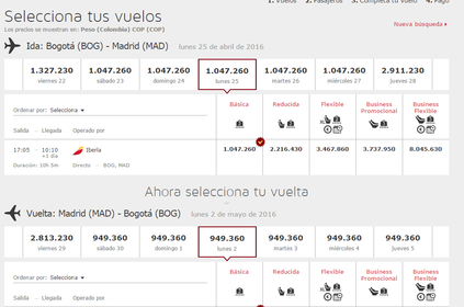 Saliendo desde Bogota el día lunes 25 de abril del 2016 a las 5:00 pm hora local con una duración de 10 horas de vuelo arribaremos ha Madrid España aproximadamente a las 9:00 am hora local allí nos encontraremos con un encargado del hotel escogido por el turista ; nuestra permanencia sera hasta el día lunes 02 de mayo del 2016. Cuando estaremos