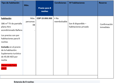 TIQUETES.Gastos pasaje avión ida y regreso.Ida $ 1.047.260 Por persona. Total por 8 pax = $ 8.378.080Regreso $949.360 Por persona. Total por e Pax = $ 7.594.880HOSPEDAJES.Habitación doble $2.147.6194 Habitación doble para 8 Pax: $ 8.590.476ALQUILER DE COCHE.Valor 1 día. $ 250.000Valor por los 8 días. $ 2.000.000