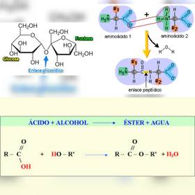 Caption: : Ejemplos de Enlace Glucosídico entre Glucosa y Fructuosa, Enlace Peptídico entre aminoácidos y Enlace Éster.