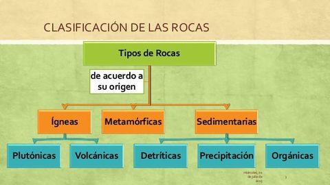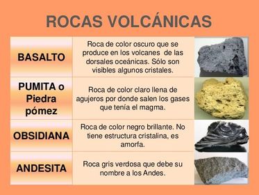Ígneas proviene de ignis=fuego, estas rocas son producto del enfriamiento y solidificación del magma. Se clasifican en:Plutónicas o intrusivas: Este enfriamiento puede darse dentro de la corteza terrestre, dando origen a rocas ígneas como el granito, gabro, etc; Volcánicas o extrusivas se forman al entrar en contacto con la atmósfera o el océano originando las rocas ígneas como el basalto, riolita u obsidiana.