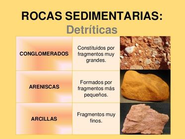 Estas se clasifican en:DETRÍTICAS son las formadas a partir de la sedimentación de trozos de otras rocas después de una fase de transporte.Las areniscas poseen granos de tamaño intermedio y los limos y arcillas poseen trozos muy pequeños.