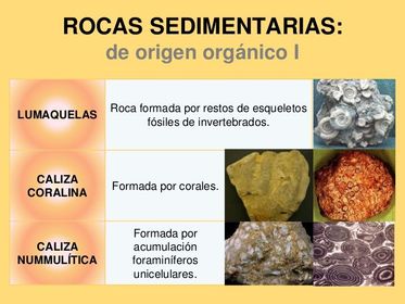 QUÍMICAS Y ORGÁNICAS son las formadas a partir de la precipitación de determinados compuestos químicos en soluciones acuosas o bien por acumulación de substancias de origen orgánico. Un tipo muy común es la roca caliza, formada en su mayor parte por restos de organismos como corales, algas.Los carbones y petróleos son rocas sedimentarias orgánicas originadas a partir de la acumulación de restos de materia orgánica. Poseen un enorme interés económico.