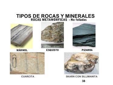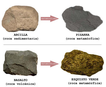 El proceso metamórfico se realiza en estado sólido, es decir las transformaciones se producen sin que la roca llegue a fundirse. La mayoría de las rocas metamórficas se caracterizan por un aplastamiento general de sus minerales que hace que se presenten alineados. Esta estructura característica que denominamos foliación se ve muy bien en rocas como las pizarras, los esquistos y los gneises. Otras rocas metamórficas muy comunes son: el mármol y la cuarcita.