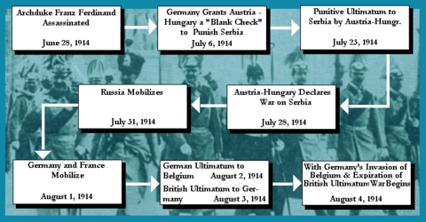 A partir de ahí la incorporación de nuevos estados al conflicto se sucedió en cascada.El 28 de julio Austria-Hungría declaró la guerra a Serbia. Rusia, aliada de Serbia hizo lo propio con Austria.El 1 de agosto Alemania rompió la paz con Rusia y dos días más tarde con Francia.La penetración alemana en Bélgica con vistas a la invasión de Francia, decidió a Gran Bretaña a declarar la guerra a los germanos (4 de agosto).Por su parte Italia, alineada en el bloque de las potencias centrales, incumplió sus obligaciones con la Triple Alianza y se mantuvo neutral (más tarde se incorporó a la guerra pero al lado de la Entente).