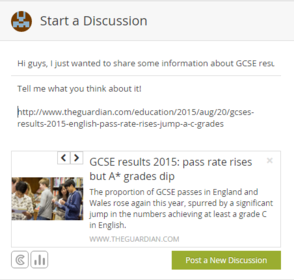 Now discussions are much more dynamic and easy to use than before and adopt the feel of social networks.To start a new discussion, select a title and description and click the "Post a New discussion" button.You can now share links , add GoConqr resources, polls, and also like posts.