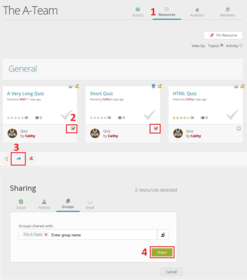 Sharing resources has never been so easy. 1. Click on the Resources Tab2. Select the resources you want to share3. Click in the share button (at the left hand corner)4. Click in share, and select the group you want to share the resource(s) withAnd enjoy sharing!