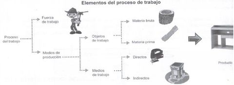 2. Medios de producciónSon todas las cosas con que el trabajador realiza la transformación del objeto en producto. Pueden ser medios directos como un martillo, un serrucho, sierra para cortar, etcétera. Son medios indirectos el lugar (local) en donde se lleva a cabo la transformación, la luz que se emplea para trabajar, etcétera.3. Fuerza de trabajo Es la energía humana que se emplea en el proceso del trabajo.4. ProductoEs el objeto que resultó del proceso del trabajo.