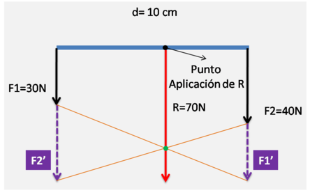 Nuestro sistema es F1 y F2 de 30 N y 40 N, separados una distancia de 10 cm.
