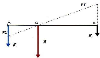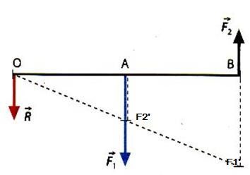 Trasladamos el módulo de F2 sobre F1 desde su punto de aplicación; obtenemos F2'.
