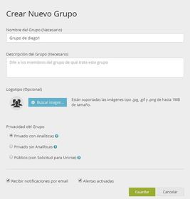 Para crear un nuevo grupo simplemente:1. Haz clic en el botón +CREAR GRUPO, ubicado en la parte izquierda de la pantalla en la sección GRUPOS2. Escoge un nombre para el Grupo y una descripción3. Selecciona una imagen que represente tu Grupo4. Elige el tipo de Grupo que deseas crear. Las opciones son: Privado con Analíticas, Privado sin Analíticas y Público.5. Haz clic en guardar